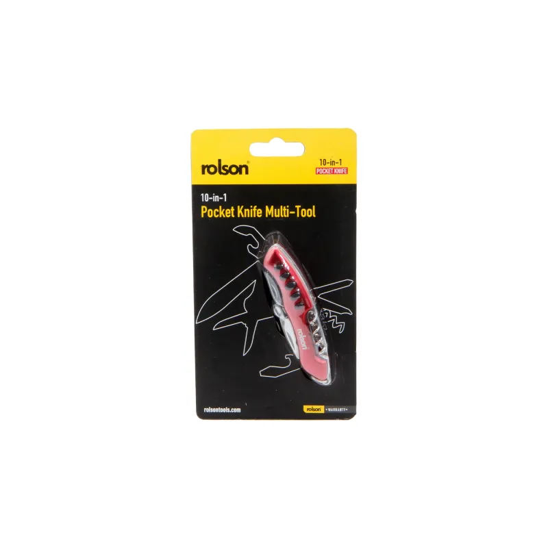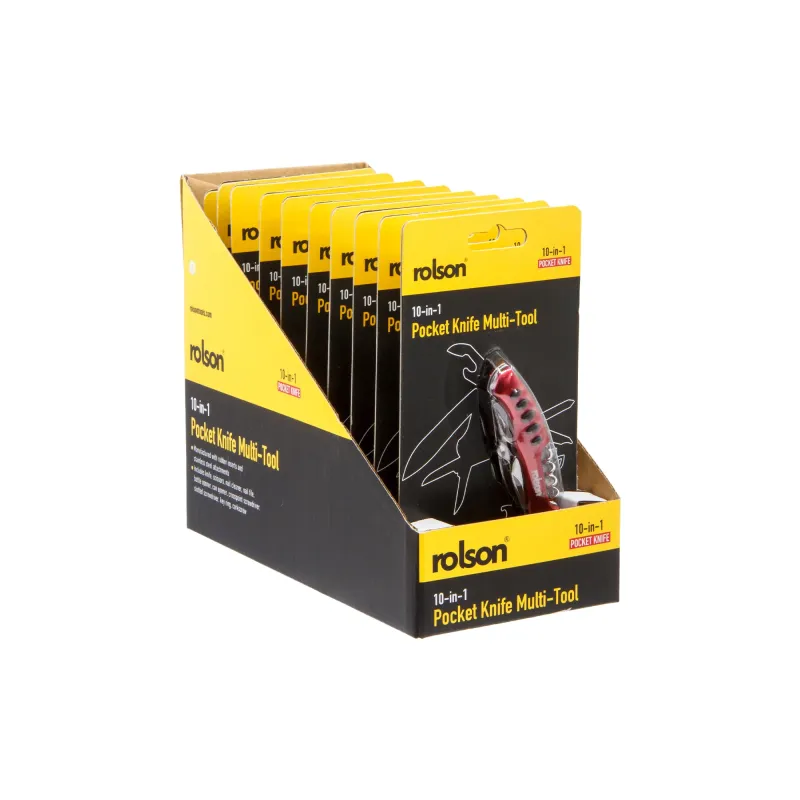 10 in 1 Multi Tool – Manufactured with stainless steel attachments and rubber inserts on handle. Runs include knife, scissor, nail cleaner, nail file, bottle opener, can opener, cross point screwdriver, slotted screwdriver, corkscrew, and key ring. 80mm when folded.