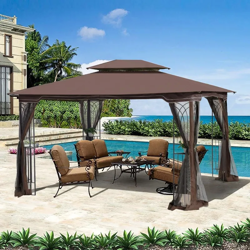 This 13x10Ft gazebo provides spacious space and is fitted with four-sided mesh for insect protection and wind and rain protection.With it you will enjoy a plush and relaxing courtyard life with your family and friends.