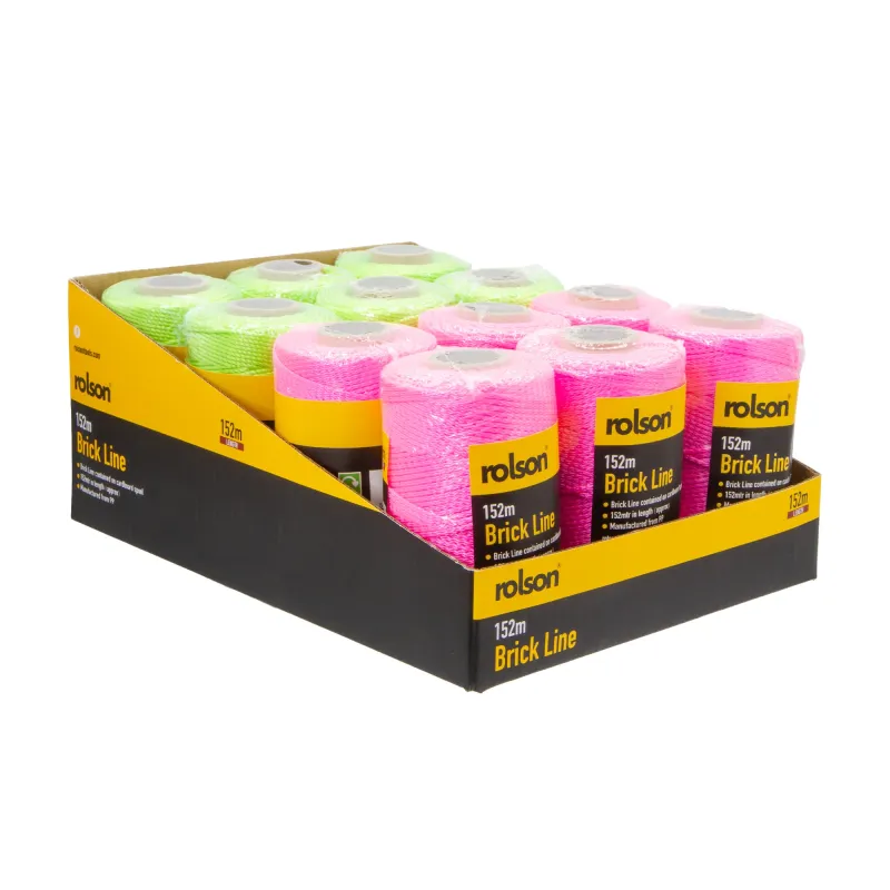 152m Brick Line – 152m brick line in fluorescent colours, supplied on cardboard roll. The display pack contains an assortment of pink and green line.