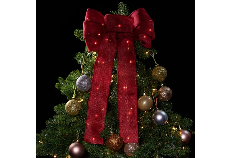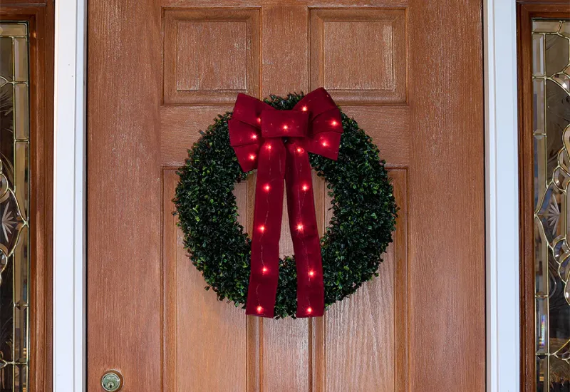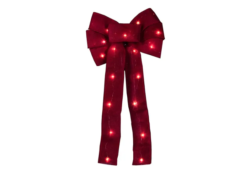 The 18″ Cordless Light-Up Holiday Ribbon adds a burst of buoyant and color to your seasonal décor. It features a festive 11″ bow with 18″ tails, plus built-in white LEDs that enhance your Christmas tree, wreath or entryway. Features an add-on timer that turns it on and off every day to conserve battery power. Features a weatherproof battery box rated for indoor and outdoor use. Hangs virtually anywhere with built-in wire ties.