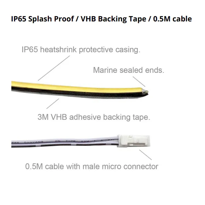 An ultra thin IP65 (splash proof) 2.4M long 2700K warmer white COB LED strip light that is continuous “no spotting”. With a 2.4M (2400mm) length it’ ideal for slatted wall panel lighting applications (floor to ceiling). At just 5 watt per meter yet still bright it’s Ideal for bathrooms, kitchens, bars or exterior areas where splash resistance is needed. Rated at 24V.