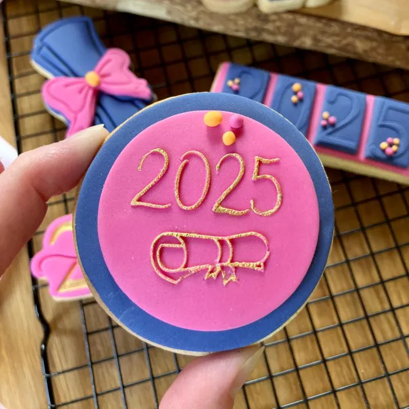 This ‘2025 with Scroll’ Cookie Embosser can be used to create beautiful and repeatable messages for your cookies. This facilitates to eliminate the inconsistency when piping as well as saving time and effort. Simply press the Fondant Embosser into your icing to produce this lovely embossed / 3D effect. Each Embosser is made from clear acrylic so you can easily see the impression area ensuring the best result every time.
