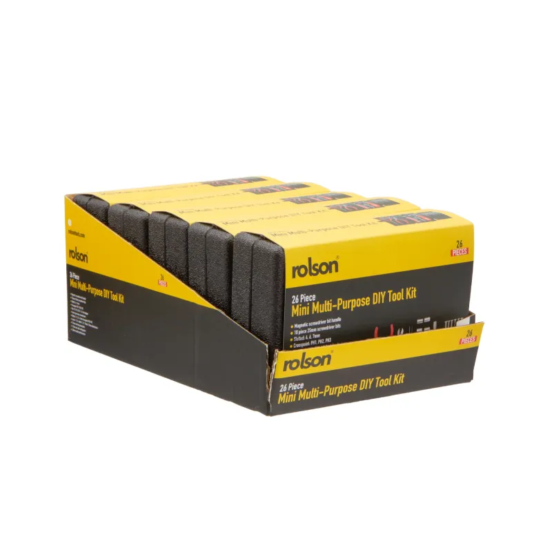 26 Piece Mini Trifold Tool Kit – Consisting of 10pc 25mm bit assortment Cross point PH1, PH2, PH3. Slot 4, 6, 7mm, Star T10, T15, T20 & adaptor, magnetic tip screwdriver bit handle, mini long nose pliers, mini side cutting pliers, tweezers, 4 sockets ¼” Dr 7, 8, 9, 10mm. 75mm extension bar, 6 precision screwdrivers 4 Slot, & 2 Cross point