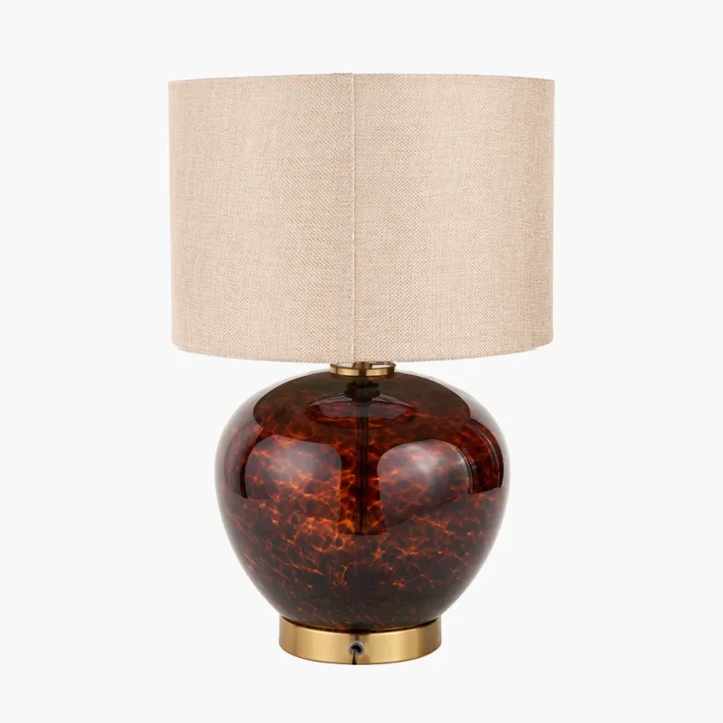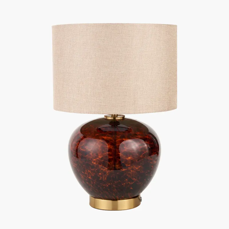 Bold, beautiful, and unapologetically glamorous—the Lucien Table Lamp is pure style in a statement piece. Its tortoiseshell glass base, elegantly curved and paired with a brushed gold base, creates a snug, rich glow even when unlit. Topped with a textured, natural cylinder shade, this lamp adds depth and sophistication to any space.