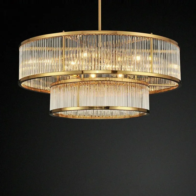 Enhance the luxury and sophistication of your living, dining room, or bedroom with our Modern Round Linear Crystal Chandelier in a stunning golden brass finish. This exquisite pendant light creates a captivating ambiance with its polished copper detailing and opulent design.
