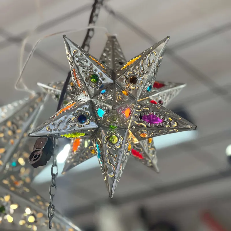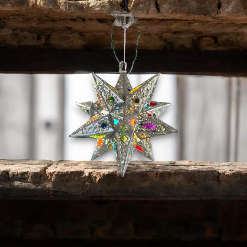 Add a touch of unique, handmade beauty to your home with this stunning all-metal star ornament. Engineered by The Talavera Hub and crafted by hand at our family partner workshop in Guanajuato, Mexico. This piece is hand-blown from lead-free glass. Featuring vibrant stained glass and designed to fit a light bulb, this piece doubles as a charming ornament and a functional light fixture. Perfect for adding character to any room or outdoor space.