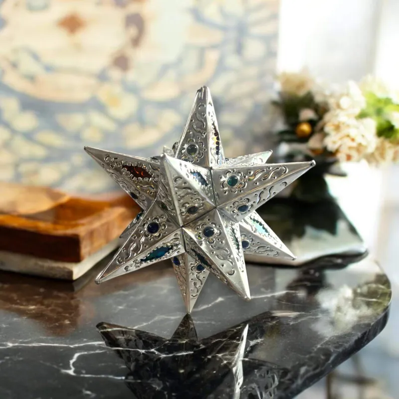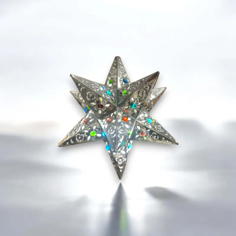 STYLE: Handmade metal star ornament with stained glass accents, designed for a one-of-a-kind decorative experience. This piece is made for indoor use only.