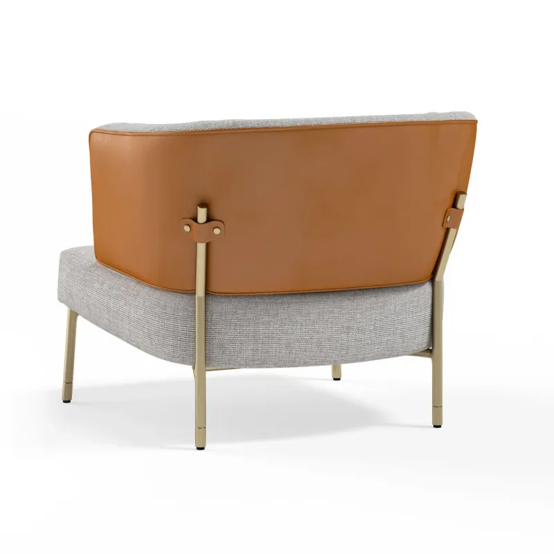 DESCRIPTION AS PICTURED: Outback & flaps in leather art. Cuoio col. Kestral Tan, seat & backrest in fabric Madison col. 610, metal base & inserts in light gilded satin finish.