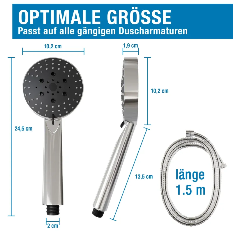 𝗨𝗡𝗜𝗩𝗘𝗥𝗦𝗘𝗟𝗟𝗘 𝗣𝗔𝗦𝗦𝗙𝗢𝗥𝗠 & 𝗘𝗜𝗡𝗙𝗔𝗖𝗛𝗘 𝗠𝗢𝗡𝗧𝗔𝗚𝗘 Der Duschkopf sowie der Schlauch lassen sich problemlos an allen gängigen Dusc