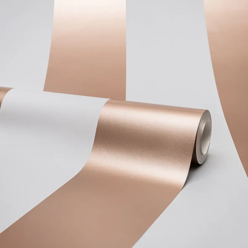 Stripes have never looked so seductive. Blending the bold allure of metallic copper with the contrasting cool elegance of grey, our Ava Stripe wallpaper turns your walls into a statement piece. Perfect for adding drama to bedrooms, living spaces and dining areas alike, this striped copper wallpaper works well alone or as a feature wall alongside a complementary hue. Its easy-hang design makes installation simple, while its duo-tone finish injects a touch of luxury. Style Ava Stripe with lustrous elegant fabric throws and gleaming metallic decor for a high-fashion flair, or juxtapose with current furnishings for an understated edge.