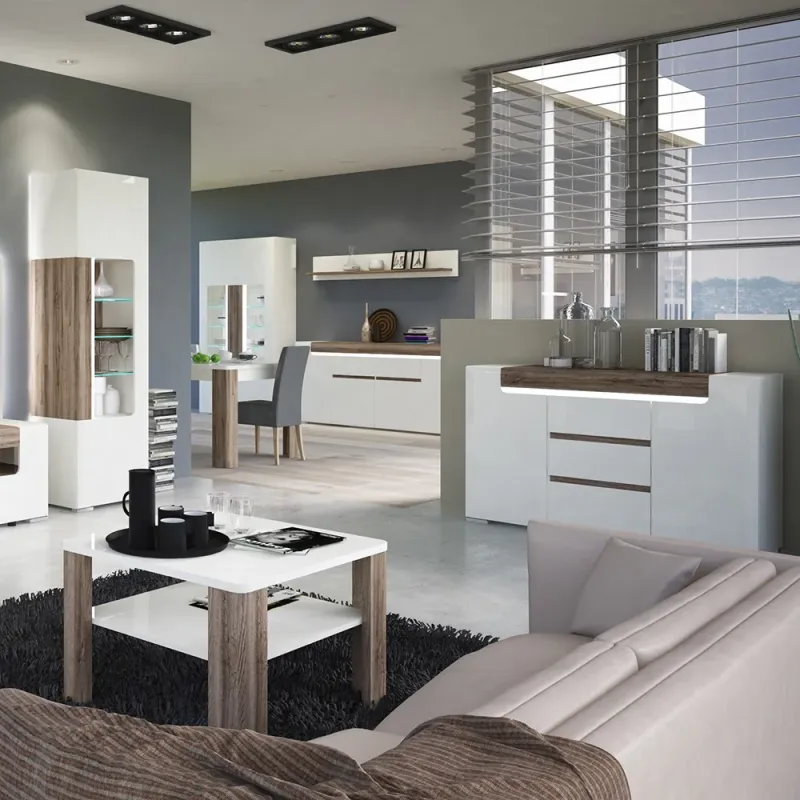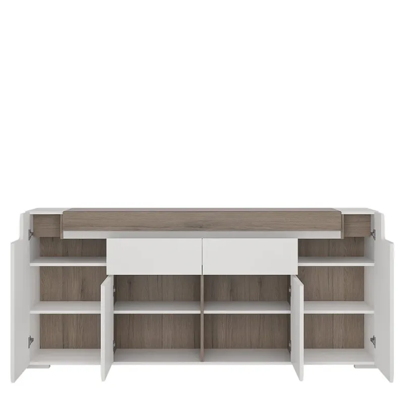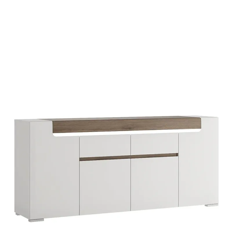 Bronxdale Wide 4 Door 2 Drawer Sideboard (inc. Plexi Lighting). This 4 doors 4 drawer sideboard has many features including soft-close doors and drawer, internal LED lighting and customizable shelves.