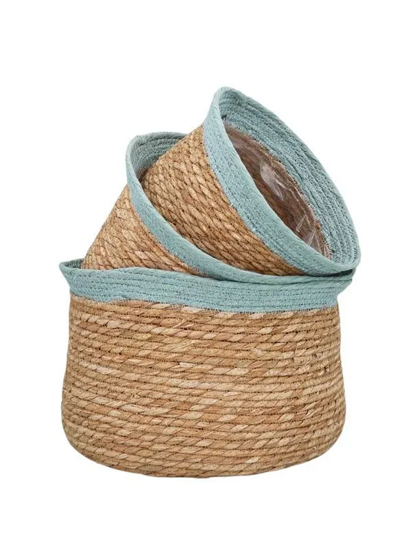 Natural woven tub baskets accented with blue trim are available in 3 sizes (this is Small), offering a practical and attractive way to keep your home neat and orderly. Engineered to nest inside each other, they save space when not in use.
