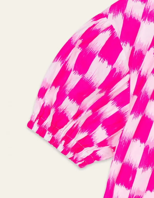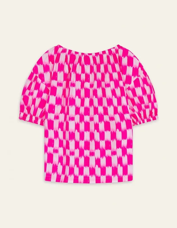 Wear this blouse the way you want. The elastic details provide playfulness, so you can also wear the blouse off-the-shoulder and play with the length of the sleeves. The pink color of the blouse catches the eye due to the utilize of screen printing. – 100% cotton – Elastic neck