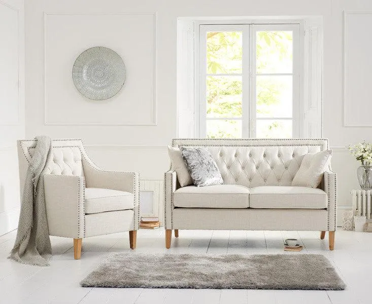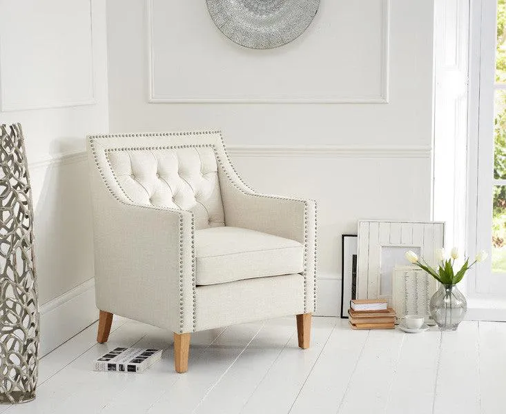 The Casa Bella Chesterfield Ivory Fabric Armchair is a beautiful variation of the classic British Chesterfield design; it brings luxury and opulence to any living room setting. The elegant armchair is carefully constructed to ensure optimum comfort and durability.