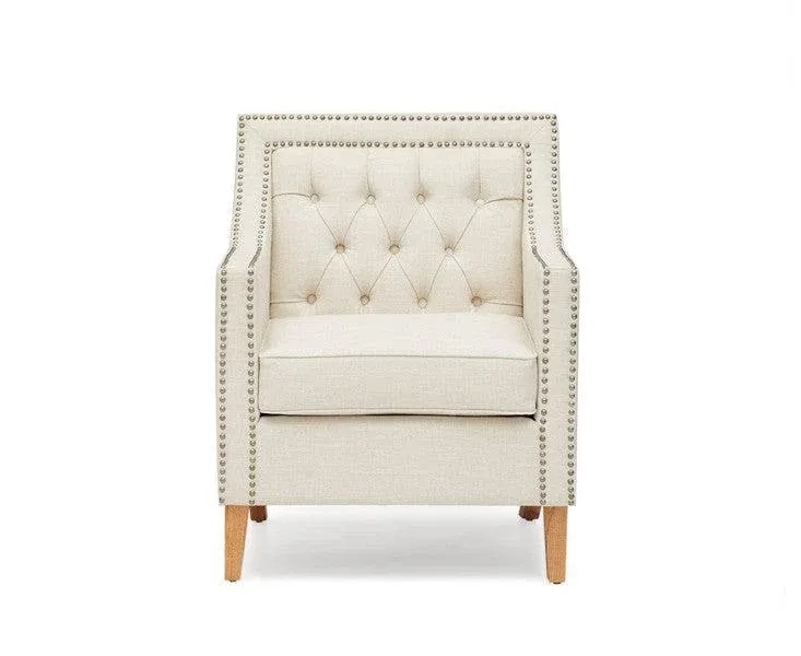 Upholstered in glossy ivory white fabric the armchair features a stunning deep buttoned backrest and deep foam filled seat cushion. Traditional metal stud detailing around the edges completes the upholstery. Tapered solid ask legs, finished authentically, are the ideal finishing touch.