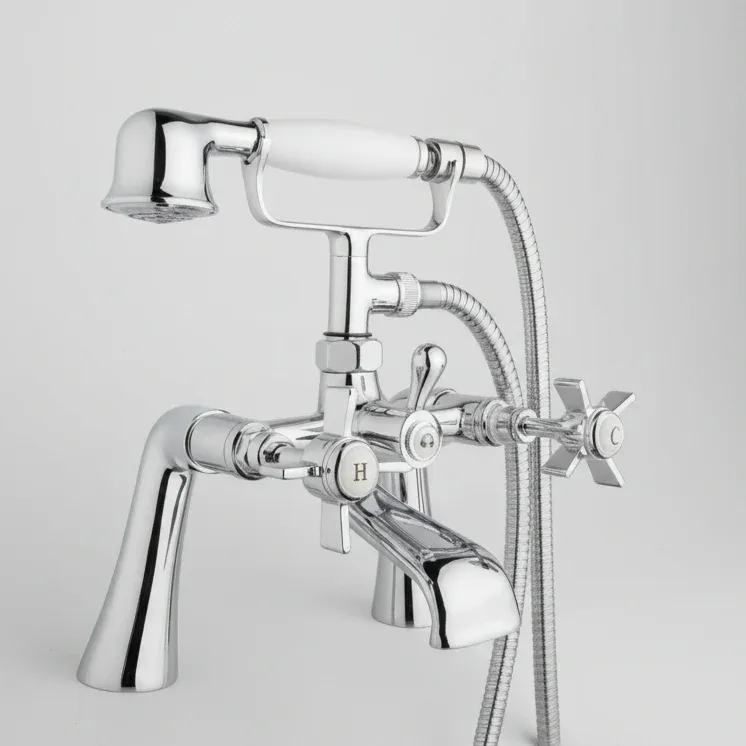 The Cashel Traditional Bath Shower Mixer is the definitive choice for those looking to capture the grandeur of a Victorian-era bathroom. Defined by its beautifully sculpted cross-head handles and iconic telephone-style cradle, this mixer serves as a stunning focal point for any heritage bath. The high-shine polished chrome finish is paired with classic “Hot” and “Cold” ceramic indices, ensuring that every detail reflects authentic period styling while providing modern, reliable performance.