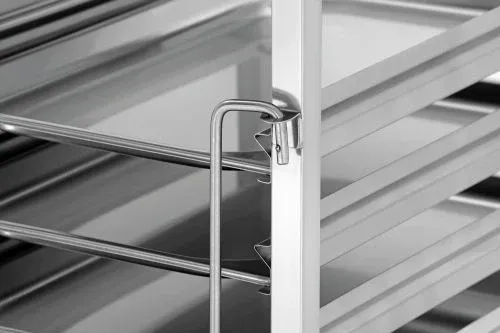 Fabriqué inox, il est équipé de 4 roulettes de direction dont 2 avec frein, de 10 cm de diamètre. Les 2 fixations, de chaque côté du chariot gastronorm, permettent un transport sécurisé de vos plats.