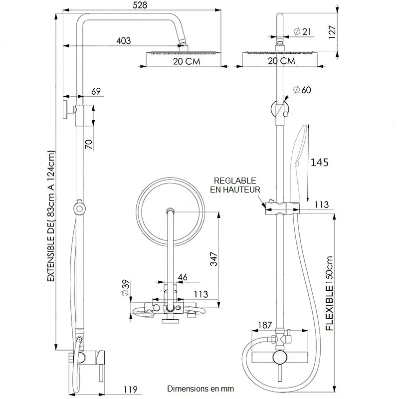 – une tête de douche ronde de diamètre 20 cm ;