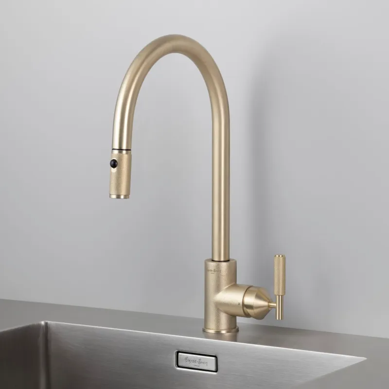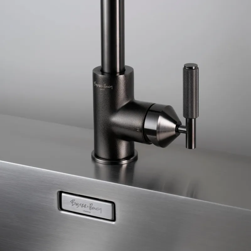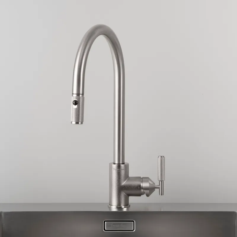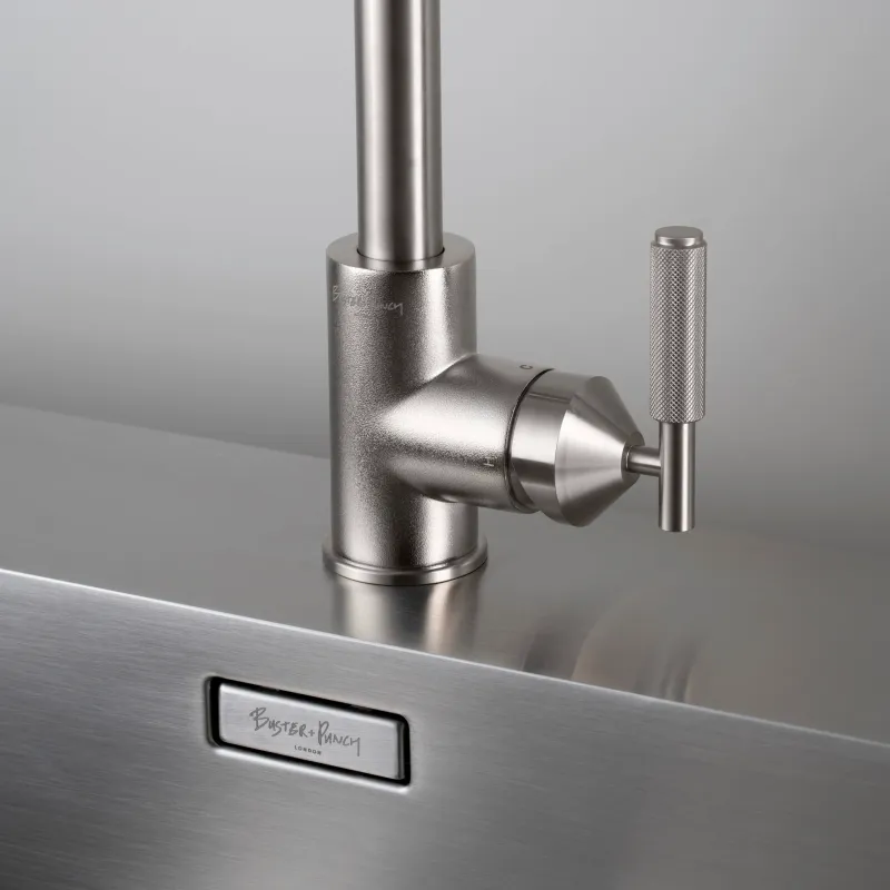 A kitchen faucet with pull-out and dual spray function, mixing heated and cold, aerated water. It’s built from rough-cast and precision-machined solid metal in Italy. It features our signature cross-knurled lever and matching knurled pull-out nozzle that can be toggled between aerated or a needle spray. The tap is cultivated by hand and finished with a subtle acid-etched B+P insignia.