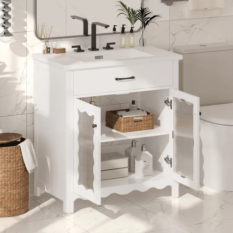 - Adjustable Interior Storage: Two soft-close doors open to reveal customizable shelves, allowing flexible organization of bathroom essentials.