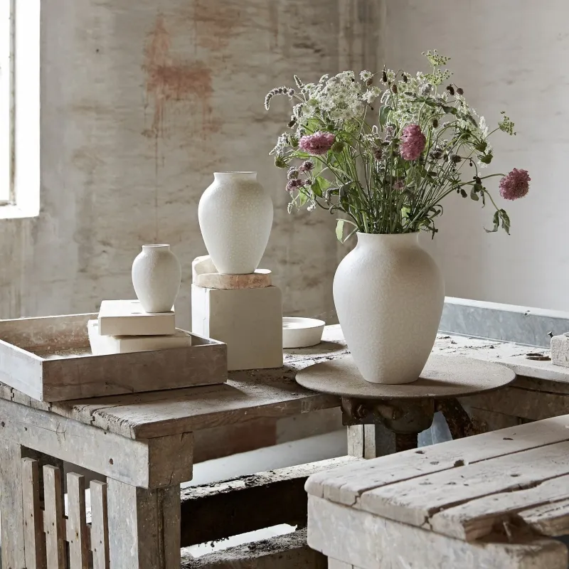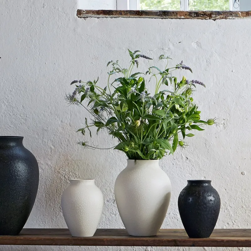 Over time, Knabstrup Keramik have produced a vast number of beautiful vases in different designs. We are especially proud of this vase. It was originally designed at the end of the 1940s, and with its elegant and traditional form it is a timeless ceramic piece that will retain its style long into the future. Today the vase is available in modern Nordic colour tones, which match our easy but cosy decor. The Knabstrup vase is designed so that it doesn’t just offer itself up for display, but can also showcase seasonal flower bouquets and greenery in the most beautiful way.