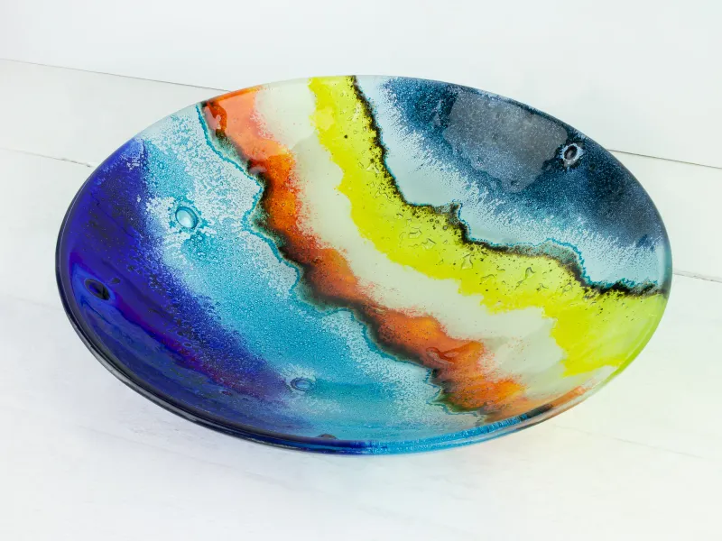 A bright series inspired by beach walks on a warm spring evening. With dazzling blues of the Atlantic Ocean, to the golds and flaming oranges of a sunset in a clear indigo sky. A beautiful piece of glass art handmade in our Cornwall studios.