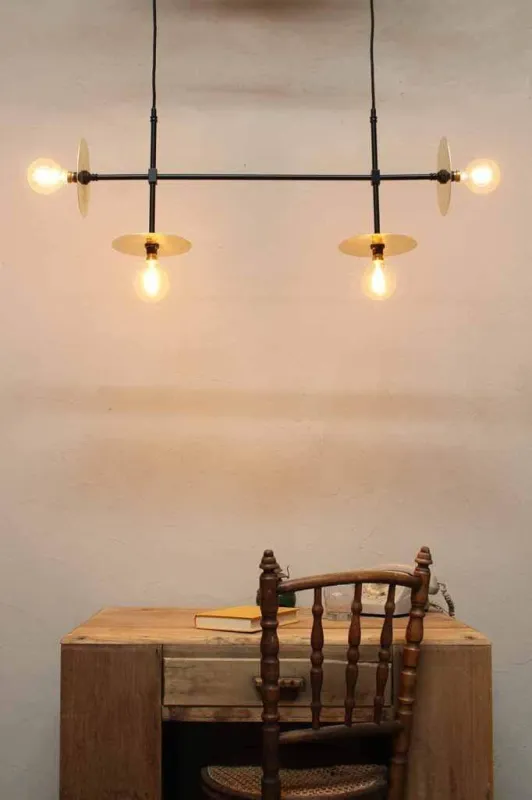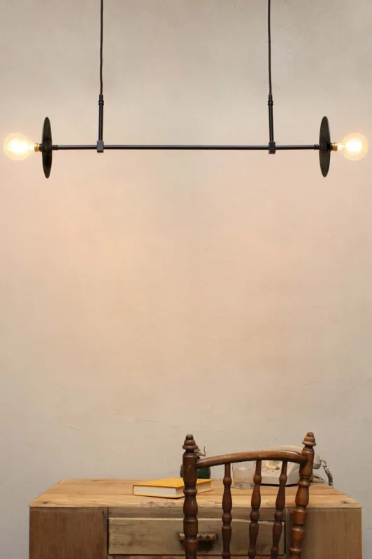 Make a contemporary statement with the Disc Junction Pendant Airy. Its hand assembled high quality brass frame is complete with a classic matt black finish. The brass frame comes in two light and four light configurations and is accented with steel or brass discs to complete its minimalist design. Its several directional quality brass frame brings a raw elegance to your interior and is the ideal centrepiece for any residential space as well as commercial or hospitality fit outs. Available only at Fat Shack Vintage!