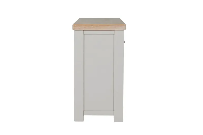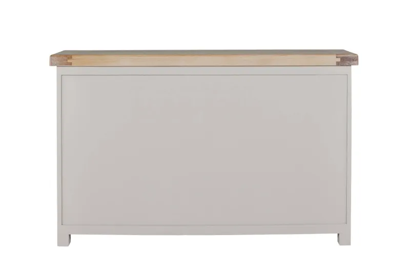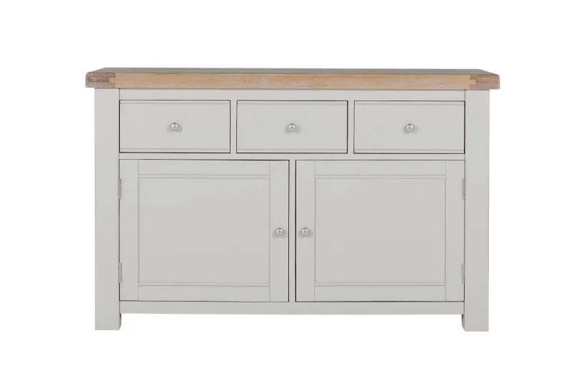 Doune Large Sideboard in Taupe, a versatile addition to any room. This large sideboard has a stylish painted finish with an graceful oak veneer top. It offers practical storage with three drawers and two doors, plus internal shelving for organised space. The sleek metal handles and balanced design make it both functional and fashionable.