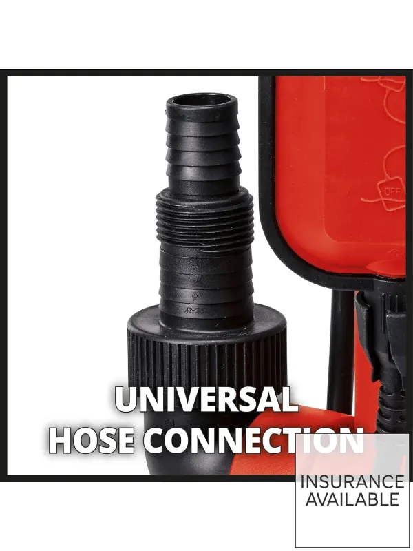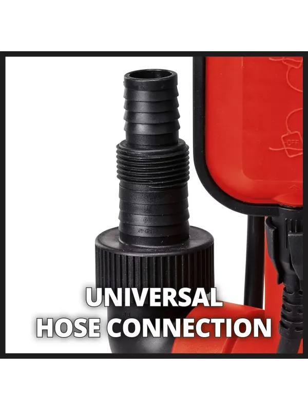 The pump is equipped with a general-purpose adapter for 25/32 mm hoses and a G 1 male thread (33.3 mm)as well as a 90° bracket for different hose connection.