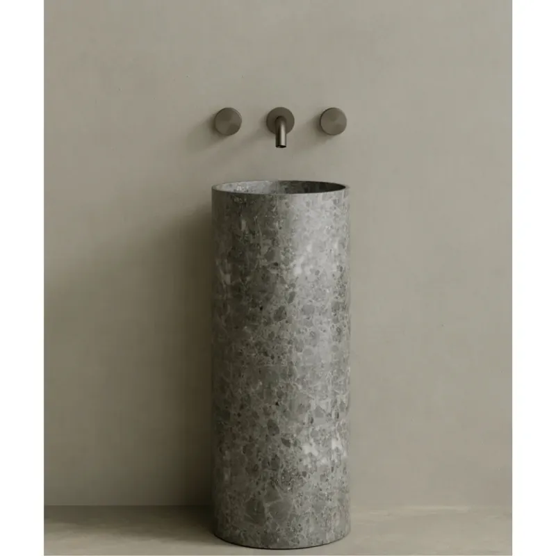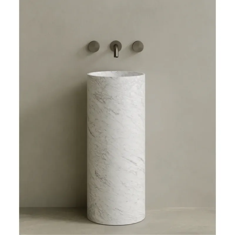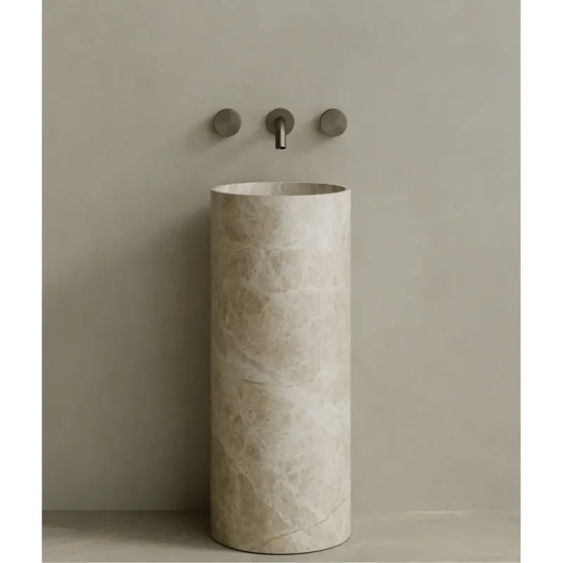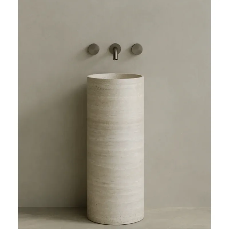 The Colva Freestanding Pedestal Sink introduces a refined sculptural silhouette with its slim, rounded form and pared-down profile. Hand-carved from natural stone, this monolithic sink offers a fluid presence and smooth surface, making it an understated yet impactful addition to any contemporary bath space.