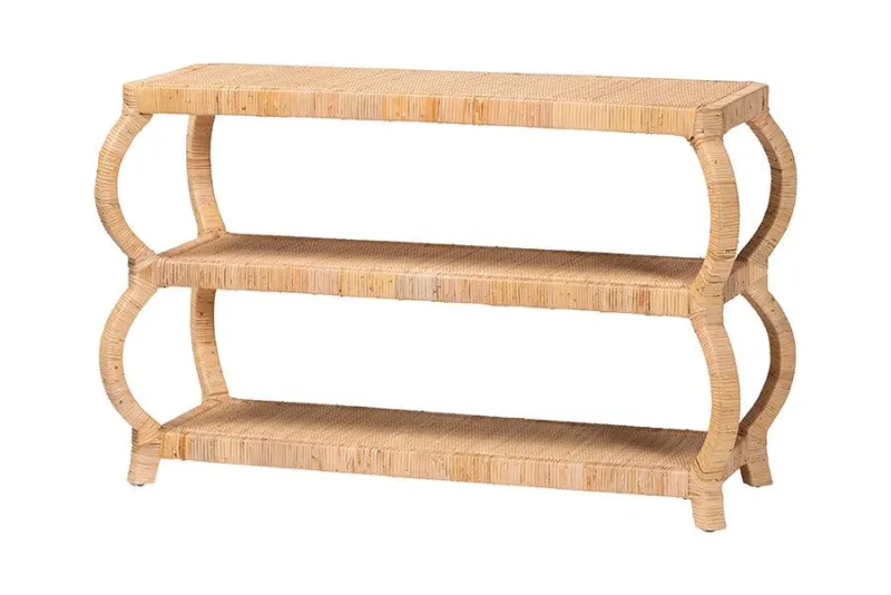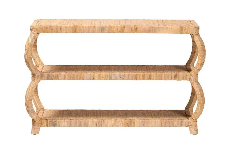 Exuberant rustic design arrives in the remarkable form of the Dalida console table. Made in Indonesia, this bohemian piece consists of a basic mahogany wood frame wrapped in natural rattan. Three tiers of open shelves offer ample space to organize and display a variety of decorations, uplifting any living room, entryway, or other open layout. The Dalida will arrive completely assembled and features unique rounded legs that stand out with an aura of exotic artistry while providing excellent stability. Steeped in the aura of paradise, the Dalida console table elevates any arrangement. Disclaimer: Rattan is a product of nature and may have variations in areas such as, but not limited to, color, pattern, grain and texture. The hair-like strands of rattan/rattan-fiber are common due to the nature of the material.