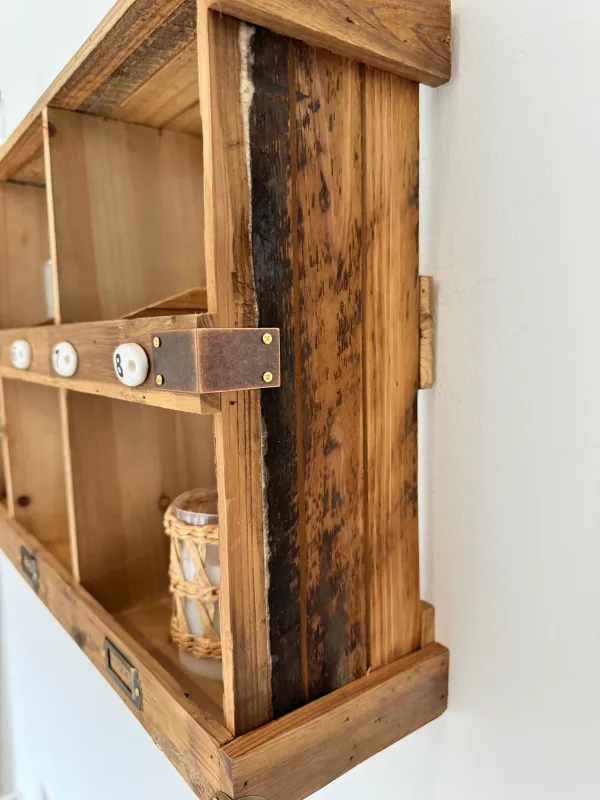 The Rustic Wood Wall Shelf – Aged Wood Display Unit combines practicality with vintage-inspired design. Made from aged fir wood, this wide wall-mounted unit features eight numbered compartments perfect for displaying candles, plants or small decorative pieces.