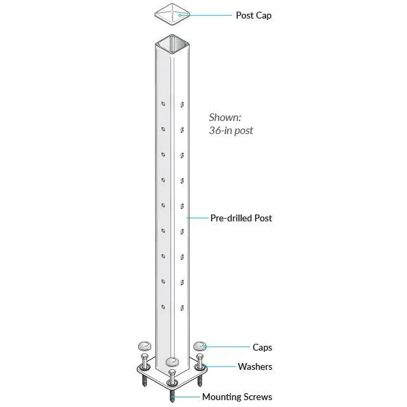 DesignRail Kit (NP) Newel Passthrough Post Kits transition between Level and Stair Rail where the railing runs in a straight line through the post then downstairs at an angle. This is a non-terminating post, where the cable passes through. Pre-drilled posts for 1/8″, CableRail Kits sold separately, use with Swift Connect Stair Post, Threaded Terminal level Post, Level Rail Kit, and Stair Rail Kit. 36″ Post Requires 9 Cable Runs, 42″ Post Requires 11 Cable Runs.