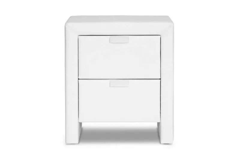The Frey Designer Nightstand makes it easy to stash your odds and ends, turning clutter into slick contemporary goodness. The Frey Nightstand is made in Malaysia with a sturdy plywood and hardwood frame topped with a thin layer of foam padding and ivory faux leather. Silver drawer pulls not only allow the two drawers to be opened with ease but add another layer of modern polish. The cutting-edge bedside table, which comes fully assembled, is also available in black (sold separately). To clean, wipe with a damp cloth. Product dimension: 18.5″W x 15.87″D x 21.5″H , drawer(2): 12.37″W x 12.62″D x 5.5″H