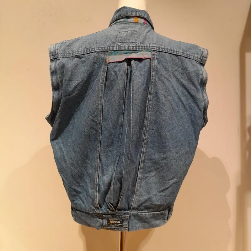 Gilet in Jeans timeless. Marca Pop 84. Tg. 40. Colore Azzurro denim. 100% Cotone. Smanicato con collo a camicia, chiuso sul fronte da cinque bottoni in metallo logati,due ampie tasche applicate e sotto due tasche a filetto verticali. Il fondo ha due applicazioni, una sul fronte che reca come decoro un’asola rossa a contrasto di colore e nel centro del retro che invece ha cucita l’etichetta del Brand. Sempre nel fondo, sui fianchi, è applicato un elastico per sottolineare il punto vita. Nel giro maniche interno le cerniera per eventualmente attaccare le maniche, che pero’ non sono presenti. Buone condizioni.