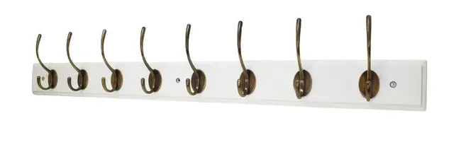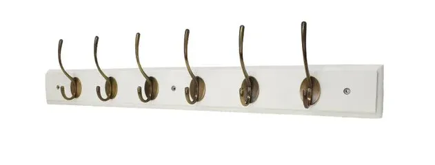 The stylish Harcourt Hat & Coat Hook Rail with traditional antique warm alloy hooks mounted on a chunky ivory board. Pre drilled for easy fixing and comes supplied with wall plugs and screw fixings.