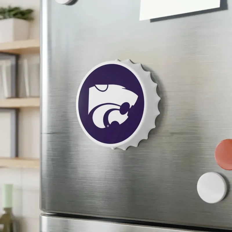This bold, purple Kansas State University magnetic bottle opener featuring the Kansas State Wildcat. Sizeable at 2.5″ in diameter, it’s equipped with a handy magnetic back, a unique bottle cap shape, and two different ways for opening bottles, this has it all. Show your Kansas State pride as you enjoy your favorite beverages!