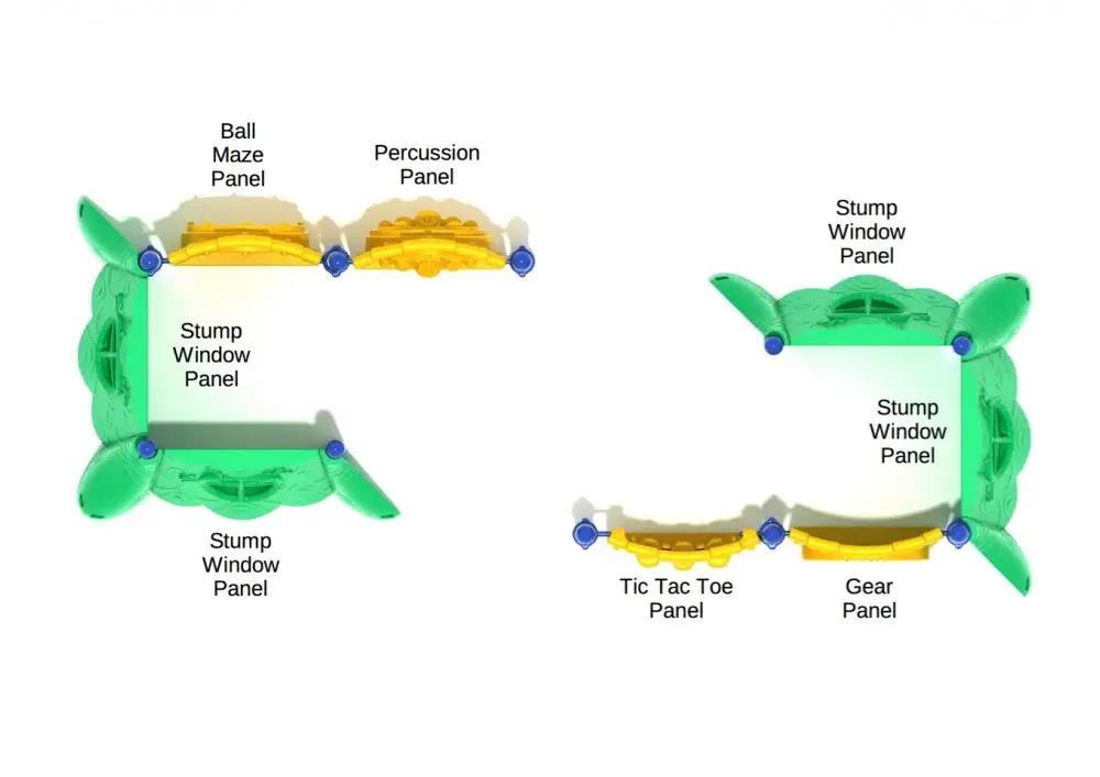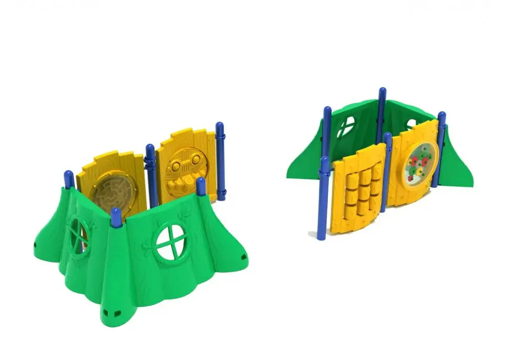 Provide children with a place to hide away, play games, and more by adding the Henry Hornbill structure to your playground. Not only does it act as a private place for children to hang out and use their imagination, it also furnishes the entertainment itself. All of its activities are made to not only provide enjoyment, but also mental stimulation. It is built from four Stump Window Panels, a Gear Panel, a Ball Maze Panel, a Percussion Panel and a Tic-Tac-Toe Panel. The Ball Maze and Tic-Tac-Toe Panels challenge children’s minds by having them think strategically to solve problems. The percussion Panel engages their creative sides as they listen to the sounds and musical patterns they can make. The Gear Panel inspires children to think like engineers about machines and how they work. Henry Hornbill is a self-contained play space that can provide hours of enj