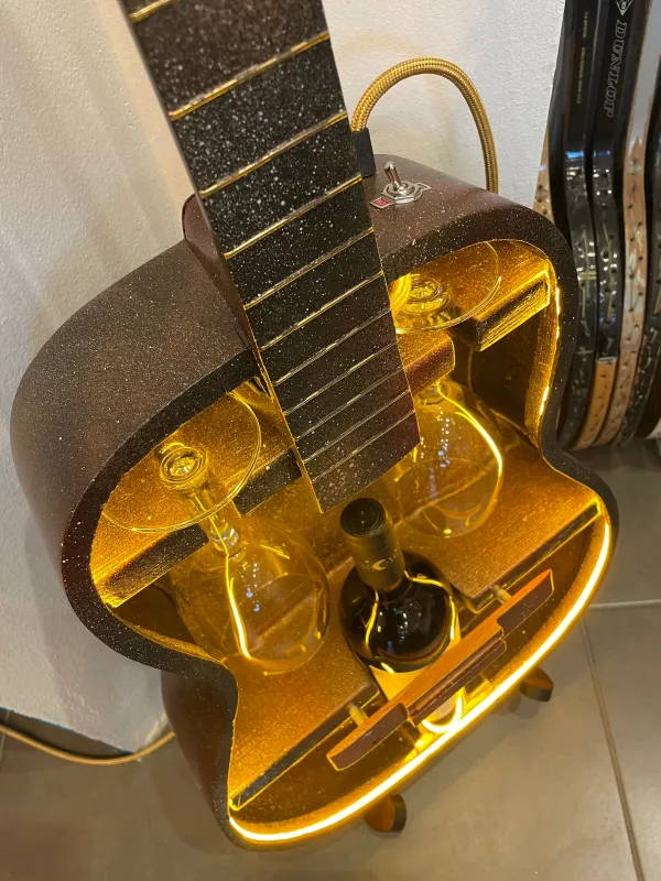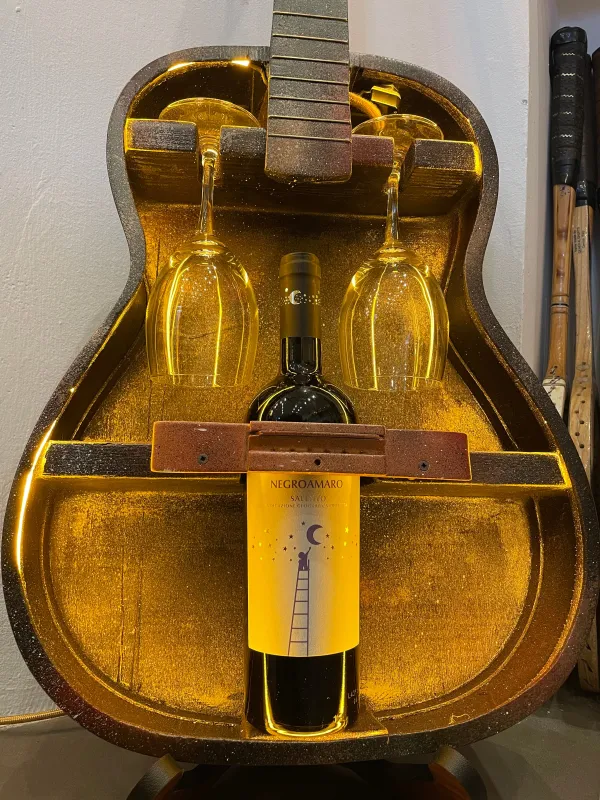 Chitarra Classica tarsformata in porta calici e bottiglia di vino
