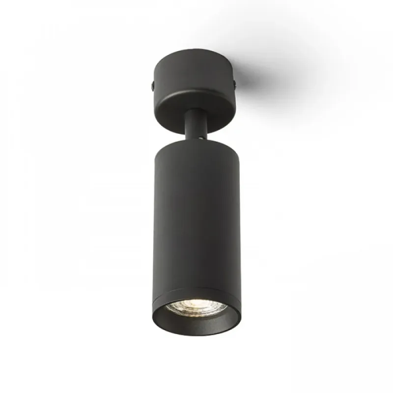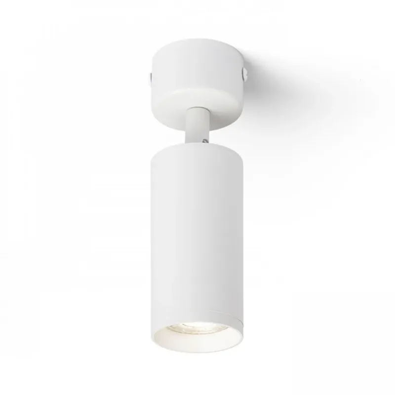 Foco cilíndrico minimalista para fontes de luz GU10 sobre base redonda. As molas conectadas ao casquilho permitem o uso de fontes de luz de vários comprimentos.