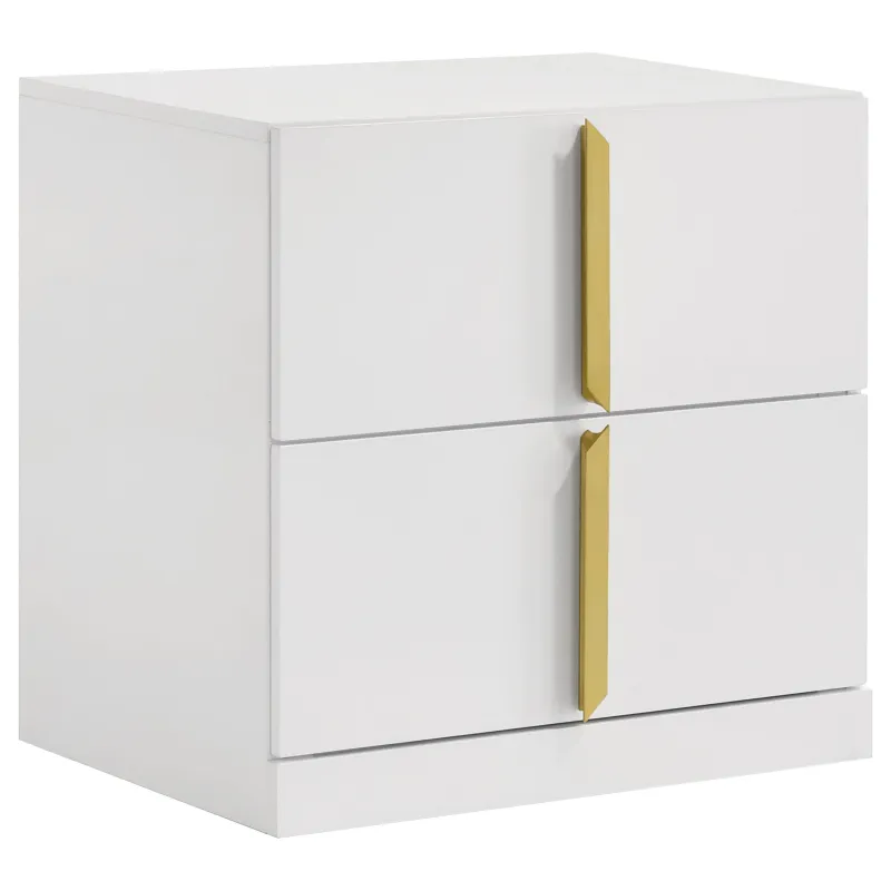 This contemporary bedroom set channels exclusive Italian style through sleek geometry and luxe material finishes. Each piece is accented with polished gold details that bring sculptural contrast to clean, modern lines. Case goods are wrapped in eco-friendly PET thermoplastic for a glossy, durable, and easy-to-clean surface, while the bed features soft woven upholstery with bold gold perspex trim. A refined blend of form, function, and everyday resilience.