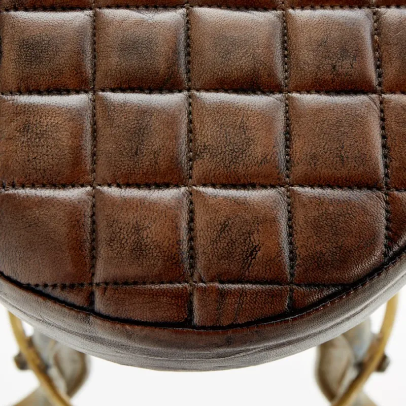 The Abbey Stool is a sleek, upholstered bar stool made of iron and leather, with an aged brass finish. The stool is rustic with a hint of industrial chic, making it the flawless complement to current and contemporary decor. adjustable height seat.