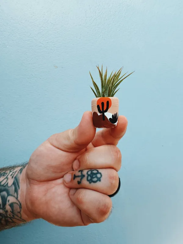 This Planter plus plant is a cute, handmade planter made of concrete and painted and planted by me. It’s approximately 2 inches tall and 1 inch broad. It is planted with an air plant. As for care: keep in authentic light. Mist the plant once a week. What’s included: Mini Pot A plant Card for the store to display that describes plant care