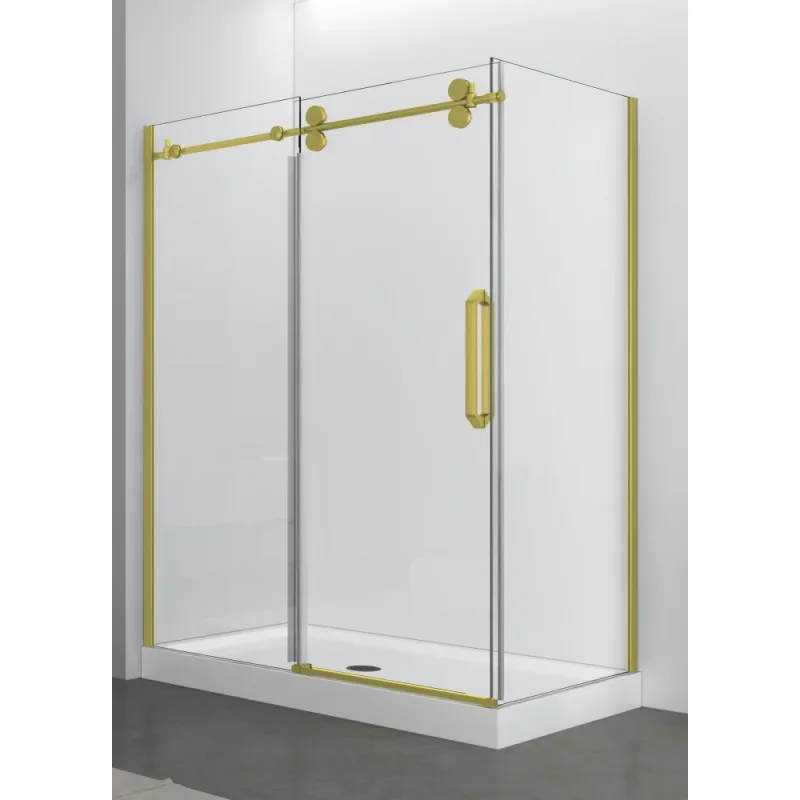 Vous aimerez ses accents arrondies or mat dans le mécanisme sur rail qui accentuent le look moderne de la douche. Porte de douche haut de gamme, Grandeur : 48 po et 60 po xxx Porte réversible, peut s’installer à gauche ou à droite xxx Ouvres à gauche, ou à droite.