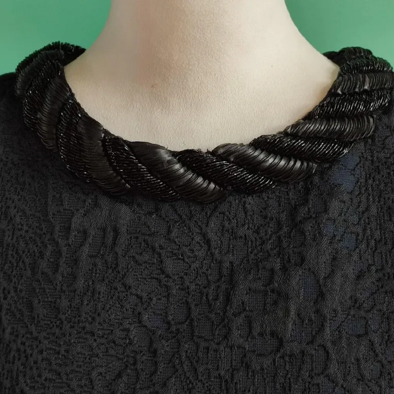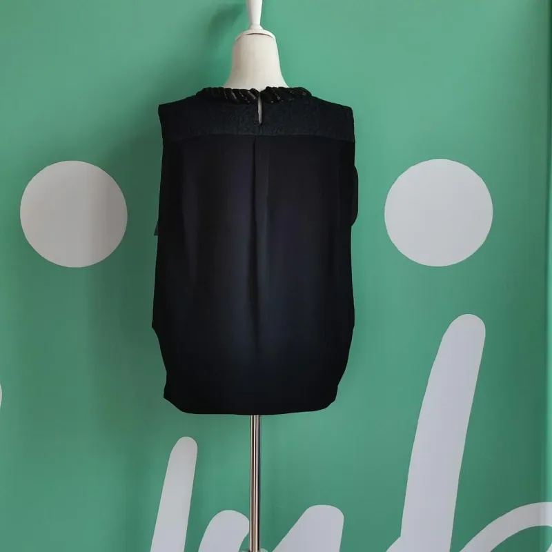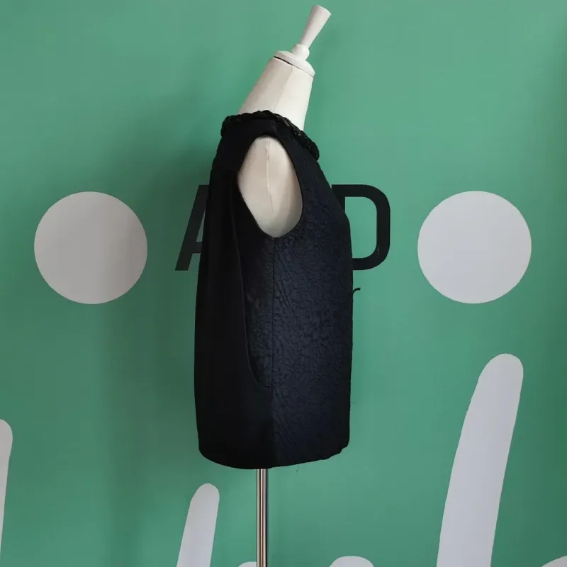 Top a canottiera marca AMEN, taglia S di colore nero e blu notte. Il capo si presenta con una lavorazione a rilievo simil “ragnatela” sulla parte frontale, presenta inoltre sul girocollo una serie di fili di pelle e perline nere intrecciate tra di loro. Il capo presenta diverse tipologie di composizione dei materiali essendo composto da tessuti differenti: La parte più esterna è composta al 67% di cotone e al 33% di poliestere; la parte interna è composta al 95% di viscosa e al 5% di elastane; in ultimo il dettaglio presente sul girocollo composto al 63% da poliestere e al 37% da poliuretano. Capo in ottimo stato.