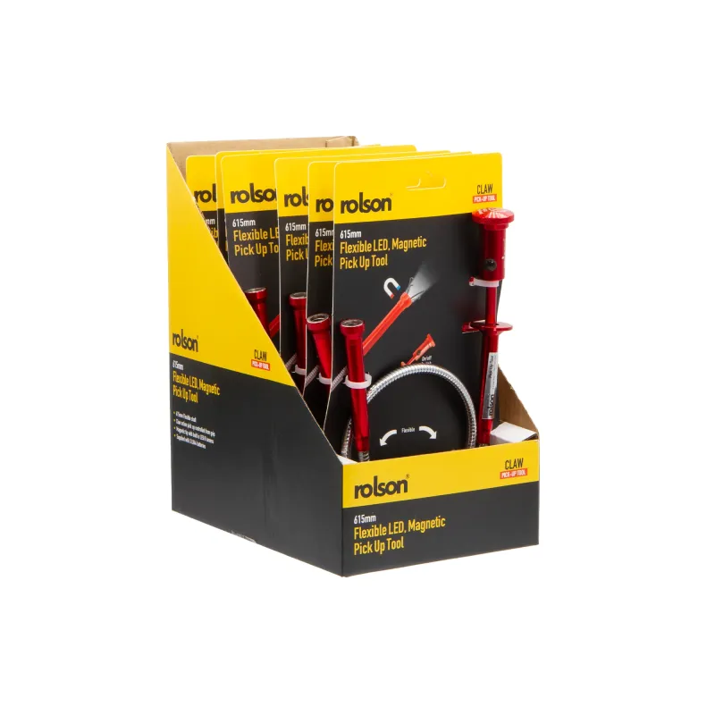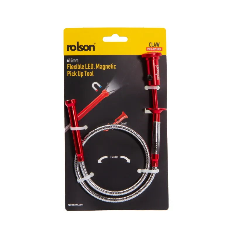 Reach into tight spaces with confidence using this dual-function pick-up tool. Its flexible 620mm shaft bends to navigate awkward angles, while the trigger-activated four-prong claw securely grasps objects. The built-in LED illuminates dark corners, and the magnetic tip safely retrieves metal items up to 1.36kg. Includes complete with three LR444 batteries, ready to tackle your next job.