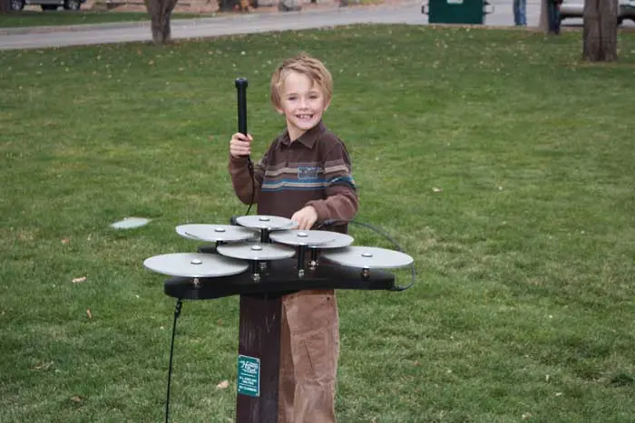 Fun for all. These 10 anodized aluminum discs have a very sweet sound. The layered placement of the discs empowers for dozens of note combinations. With 3 mallets this outdoor musical instrument can be played by 1-3 players.