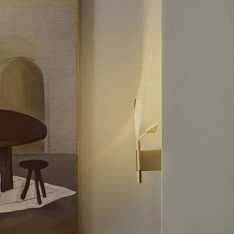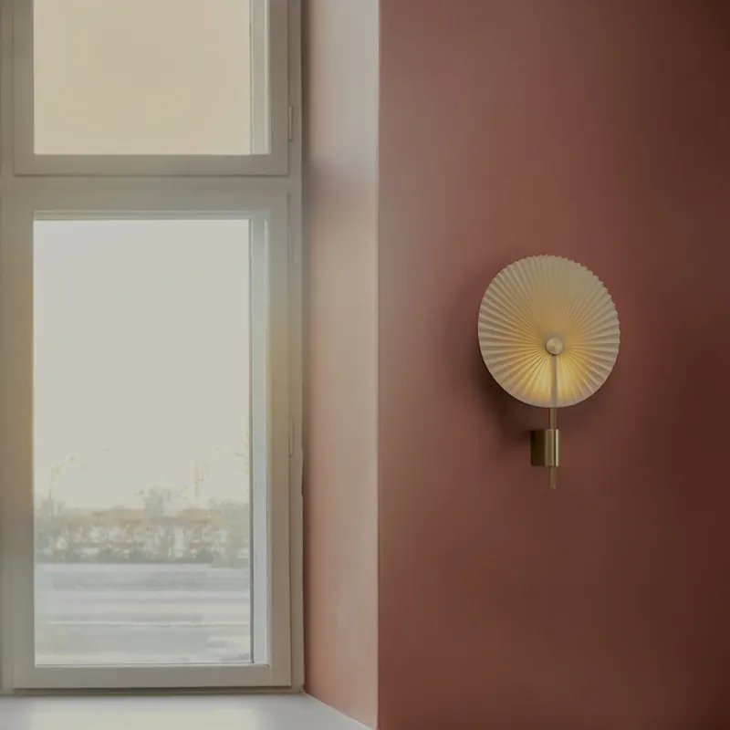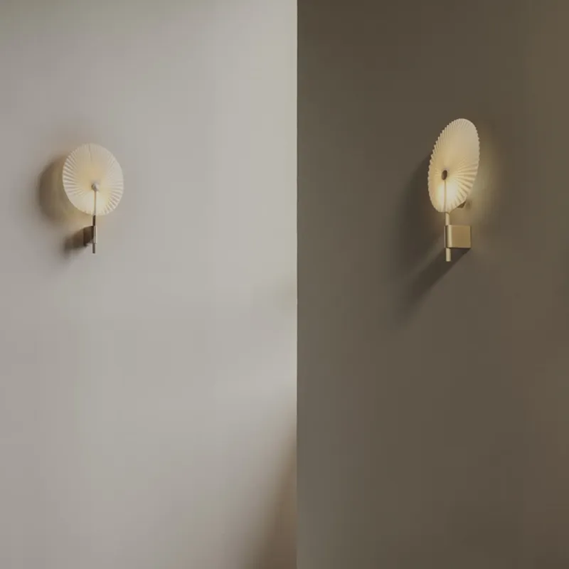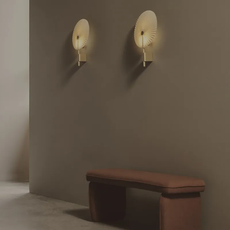 The Liris wall sconce light is a modern masterpiece of a lamp. It gives you images of the old Rome, big leafs or fans and is truly a design statement piece for your house. Design duo Thalea Schmalenberg and Kasper Fris Egelund found inspiration in the elegance of the traditional paper fan. Their fascination with its intuitive and poetic expression, as well as its materials and interactive properties, sparked the creation of their design concept: Liris.