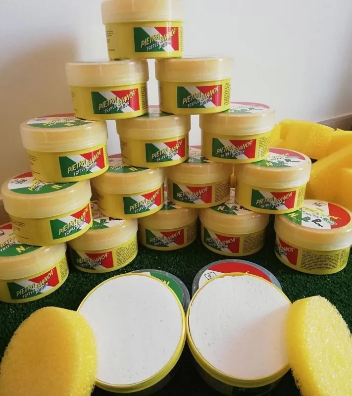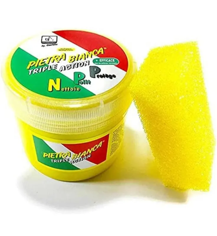 Pasta pietra bianca ha una azione pulente – sgrassante – emulsionante. Perfetta per pulire tutto, ceramica , argento, acciaio, rame, rubinetterie, pelle, legno, etc. etc. Il contenuto del vasetto risultera’ di grande durata e potra’ soddisfare centinaia di utilizzi.