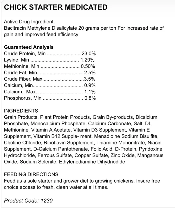 Feed as a sole starter and grower diet to growing chickens. Insure included choice access to fresh, clean water at all times.
